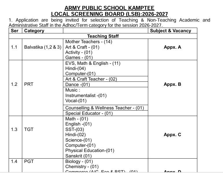 Army Public School has released the official notification for APS Kamptee Recruitment 2026. There are 73 vacancies for Teaching jobs and non teaching staff posts. The last date of APS Kamptee Recruitment 2026 is 18 April. The mode of application is offline, and candidates can submit their applications by hand/post.