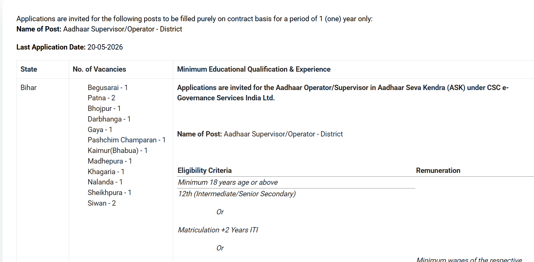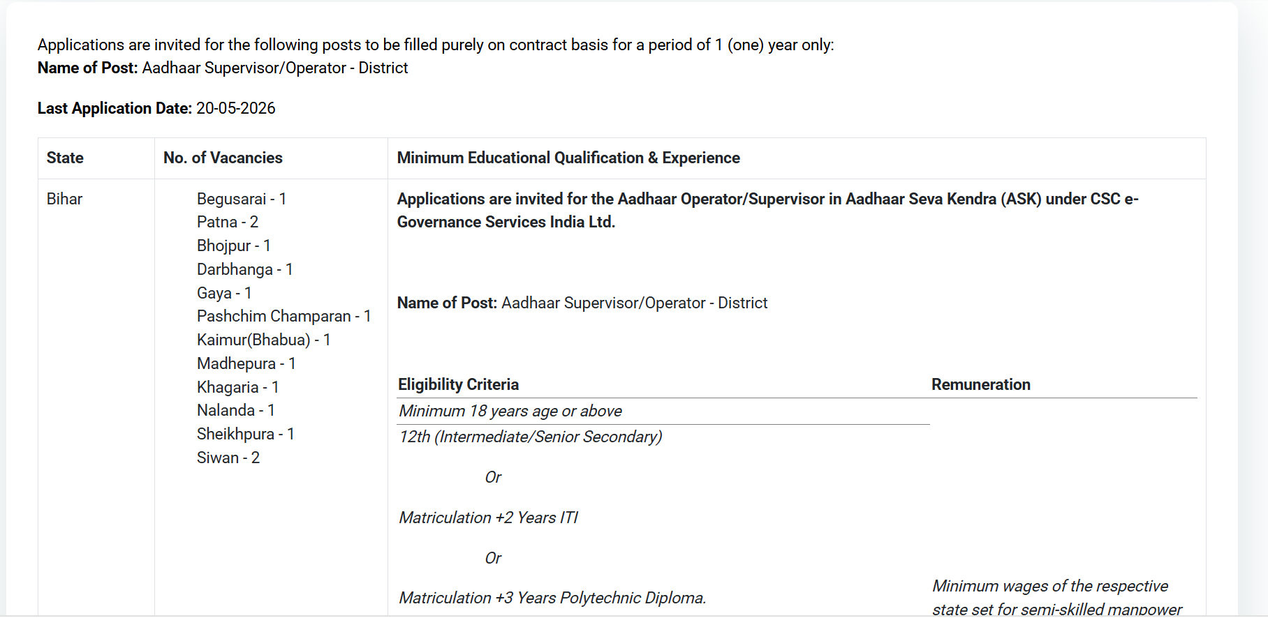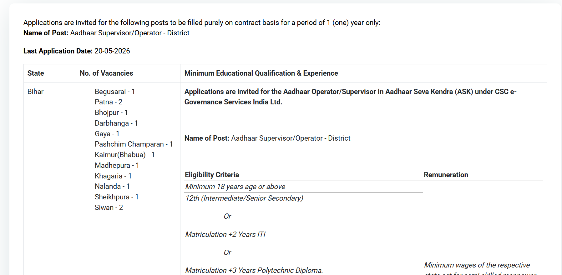 | Recruitment name | Aadhaar Operator Supervisor Recruitment 2026 |