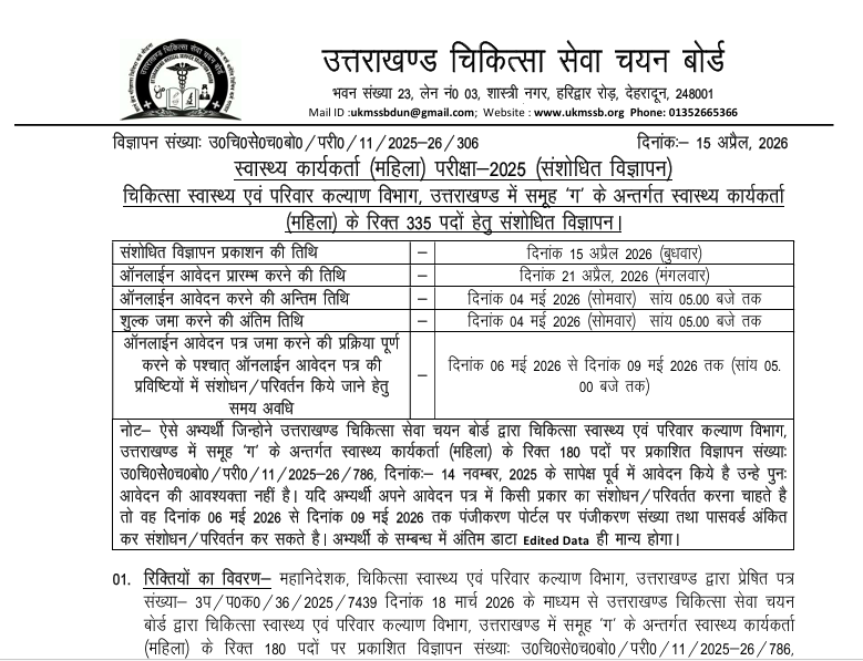 UKMSSB has released the official notification for UKMSSB ANM Recruitment 2026. There are 335 Vacancies for Health worker (Female) posts. This recruitment is specifically for the Department of Health and Family Welfare, Uttarakhand. The UKMSSB ANM Recruitment 2026 online application can start from 21 April, and candidates can complete the application before 04 May 2026. The age limit for nursing jobs is between 18 years and maximum 42 years. The candidate who applies for these 12th pass government jobs in Uttarakhand Nursing jobs must complete the ANM certification course.