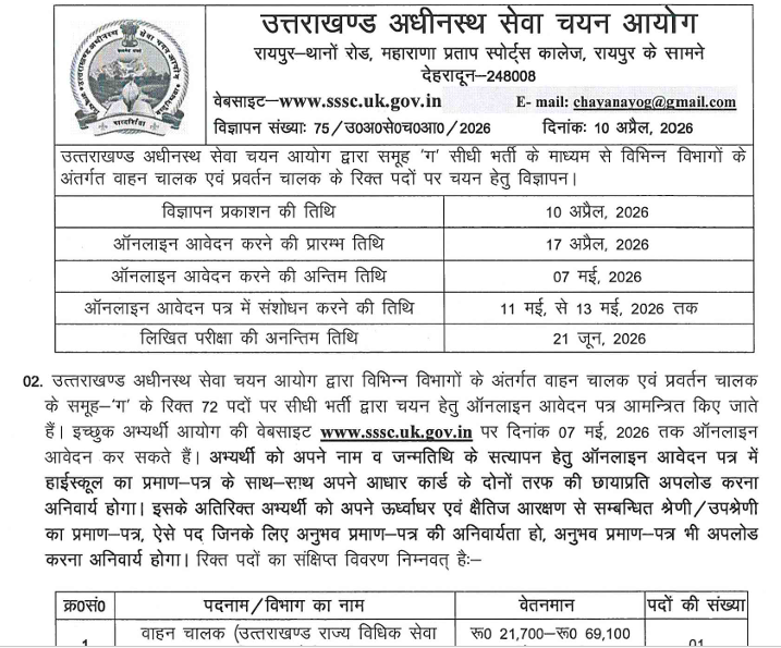 Uttarakhand Subordinate Service Selection Commission has released the official notification for the UKSSSC Driver Recruitment 2026. There are 72 Vacancies for Driver posts. The government driver job online application form will start on 17 April 2026, and eligible candidates can apply until 07 May 2026.